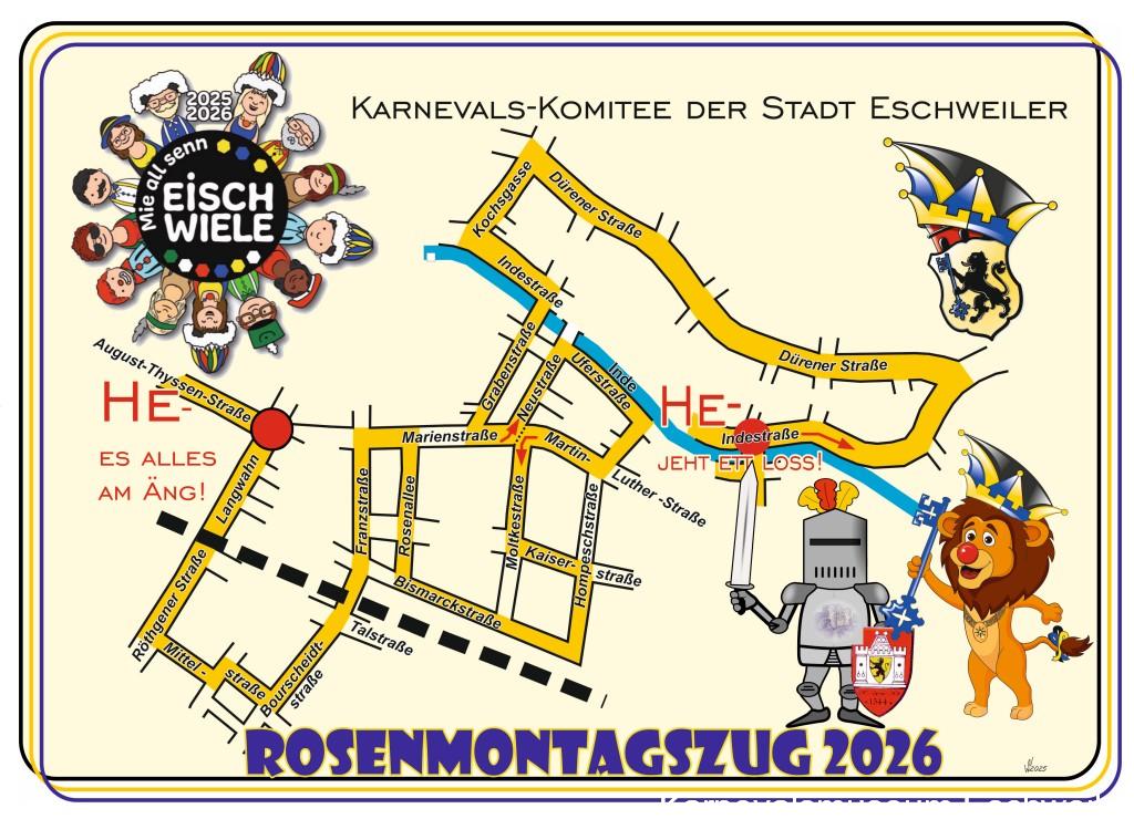In Eschweiler findet Karneval bereits seit rd. 170 Jahren statt. Am 16.02.2026 startet um 12.00 Uhr unter dem Zugmotto „Mie all senn Eischwiele“ der dritt größte Rosenmontagszug Deutschlands in Eschweiler. Insgesamt 22 Karnevalsgesellschaften und das geschäftsführende Karnevals-Komitee der Stadt Eschweiler stellen insgesamt 6.500 Teilnehmer*innen und ca. 250 Fahrzeuge. Der närrische Lindwurm bewegt sich auf einer Gesamtstrecke von ca. 6 km durch die Eschweiler Innenstadt. Der genaue Zugweg ist dem o.g. Plan zu entnehmen. Weitere Informationen, wie z.B. die Reihenfolge der Karnevalsgesellschaften, bzw. die einzelnen teilnehmenden Gruppen der Gesellschaften, sind der Homepage des Karnevals-Komitees der Stadt Eschweiler unter www.komitee-eschweiler.de zu entnehmen. Den Abschluss des Rosenmontagszuges bildet die prinzenstellende KG Nothberger Burgwache mit ihrem Prinzen Jürgen I. und ihrem Zeremonienmeister Pascal. Mit „Konfetti im Hätz“ und „Ärm in Ärm“ leben sie ihr Motto: „In Farben getrennt, aber in der Sache vereint“. Die Kleinen begeistern sie mit dem Ritter-Theo-Tanz.